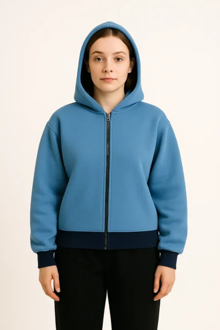 Oversized Light Blue Zip-Up Hoodie with Navy Blue Hemline