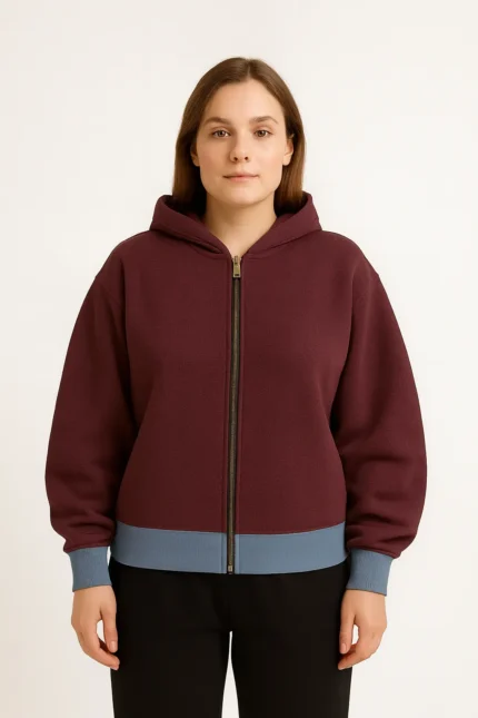 Oversized Maroon Zip-Up Hoodie with Grey Hem